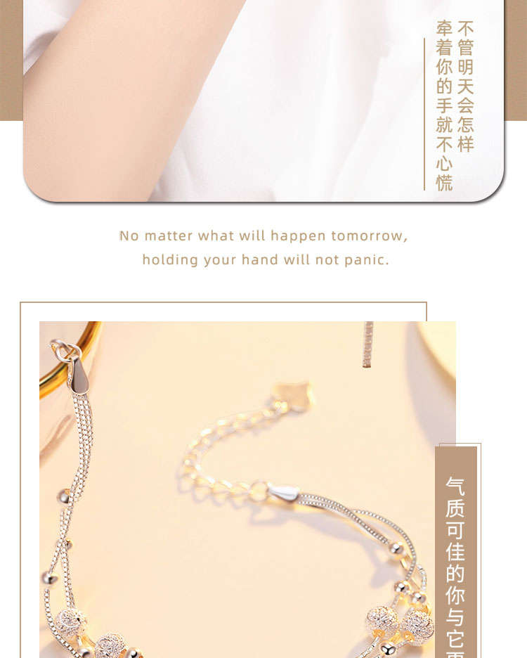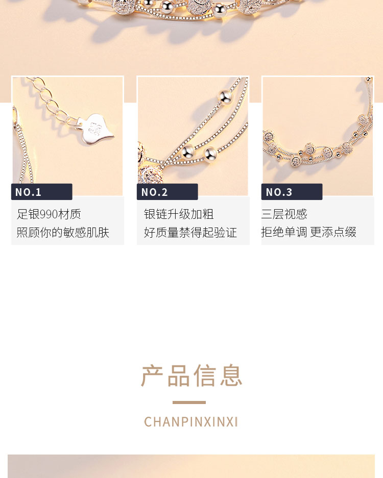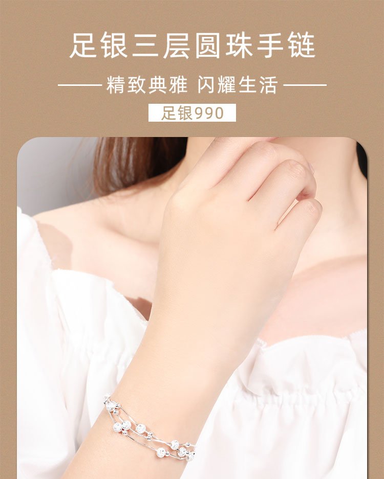 材质: 990银 适用性别: 女士 适用人群: 青年 风格: 时尚百搭 链子款式: 手链 图案: 几何图案 用途: 送礼,结婚/送爱人,生日 类型: 手链 镶嵌: 无镶嵌 执行标准: QB/T 2062-2015 产地: 中国 商品卖点: 多层圆珠 纯银手链 洗涤说明: 由于银饰品属于贵金属,容易氧化,所以经常保养可以保持银饰品色泽:1.在佩戴银饰时,尽量不要佩戴其他金属饰品,以免碰撞变形或擦伤。 2.养成良好的佩戴习惯,就寝前,沐浴前应取下银饰品。3.保持银饰品的干燥,请勿接近温泉、海水以及含腐蚀性化妆品,防止银饰因接触硫化物而产生变黑发黄现象。 4.做粗重工作时请勿佩戴,以免银饰品磨损而导致变形。5.定期保养,定期使用擦银布擦拭饰品表面,或用软布蘸取牙膏轻轻擦拭,不佩戴时请密封放在干燥阴凉处。 商品配件: 包装清单:精美包装盒*1擦银布*1品牌服务卡*1 商品编码: YSL5059