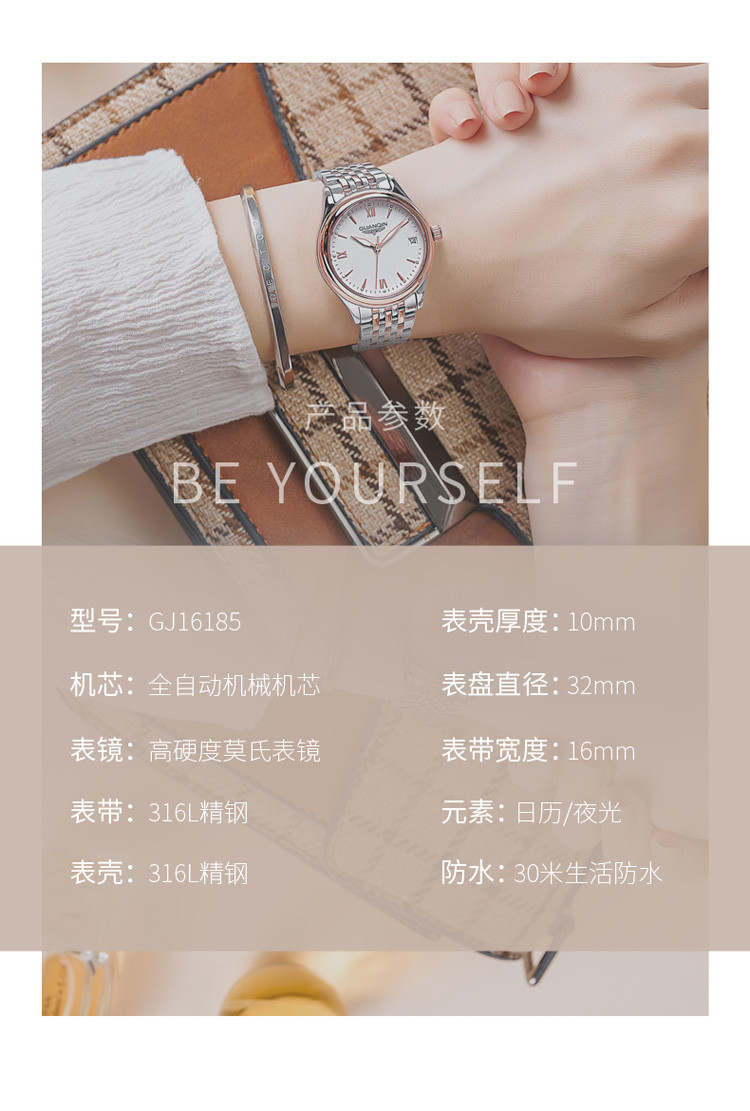 表盘直径: 28-35mm 表带材质: 钢带 功能: 计时,日期显示 表带颜色: 银色,玫瑰金 表盘颜色: 银色,玫瑰金 产地: 中国 防水深度: 30M(生活防水) 适用场景: 日常 表底: 透明 流行元素: 拼色 适用性别: 女士 风格: 优雅,清新 表盘形状: 圆形 表扣方式: 蝴蝶扣 表壳材质: 钢 表镜材质: 矿物质玻璃 执行标准: QB/T1249 商品卖点: 品牌女款销量 商品配件: 表盒*1 保修卡 *1 说明书 *1 擦表布*1 商品编码: GQJ20205MGW-玫金