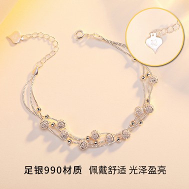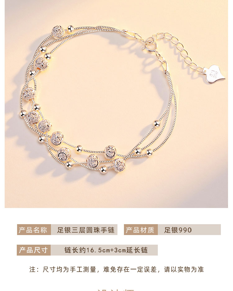 材质: 990银 适用性别: 女士 适用人群: 青年 风格: 时尚百搭 链子款式: 手链 图案: 几何图案 用途: 送礼,结婚/送爱人,生日 类型: 手链 镶嵌: 无镶嵌 执行标准: QB/T 2062-2015 产地: 中国 商品卖点: 多层圆珠 纯银手链 洗涤说明: 由于银饰品属于贵金属,容易氧化,所以经常保养可以保持银饰品色泽:1.在佩戴银饰时,尽量不要佩戴其他金属饰品,以免碰撞变形或擦伤。 2.养成良好的佩戴习惯,就寝前,沐浴前应取下银饰品。3.保持银饰品的干燥,请勿接近温泉、海水以及含腐蚀性化妆品,防止银饰因接触硫化物而产生变黑发黄现象。 4.做粗重工作时请勿佩戴,以免银饰品磨损而导致变形。5.定期保养,定期使用擦银布擦拭饰品表面,或用软布蘸取牙膏轻轻擦拭,不佩戴时请密封放在干燥阴凉处。 商品配件: 包装清单:精美包装盒*1擦银布*1品牌服务卡*1 商品编码: YSL5059