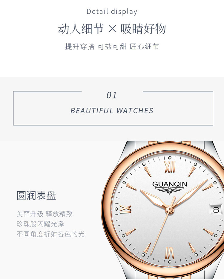 表盘直径: 28-35mm 表带材质: 钢带 功能: 计时,日期显示 表带颜色: 银色,玫瑰金 表盘颜色: 银色,玫瑰金 产地: 中国 防水深度: 30M(生活防水) 适用场景: 日常 表底: 透明 流行元素: 拼色 适用性别: 女士 风格: 优雅,清新 表盘形状: 圆形 表扣方式: 蝴蝶扣 表壳材质: 钢 表镜材质: 矿物质玻璃 执行标准: QB/T1249 商品卖点: 品牌女款销量 商品配件: 表盒*1 保修卡 *1 说明书 *1 擦表布*1 商品编码: GQJ20205MGW-玫金